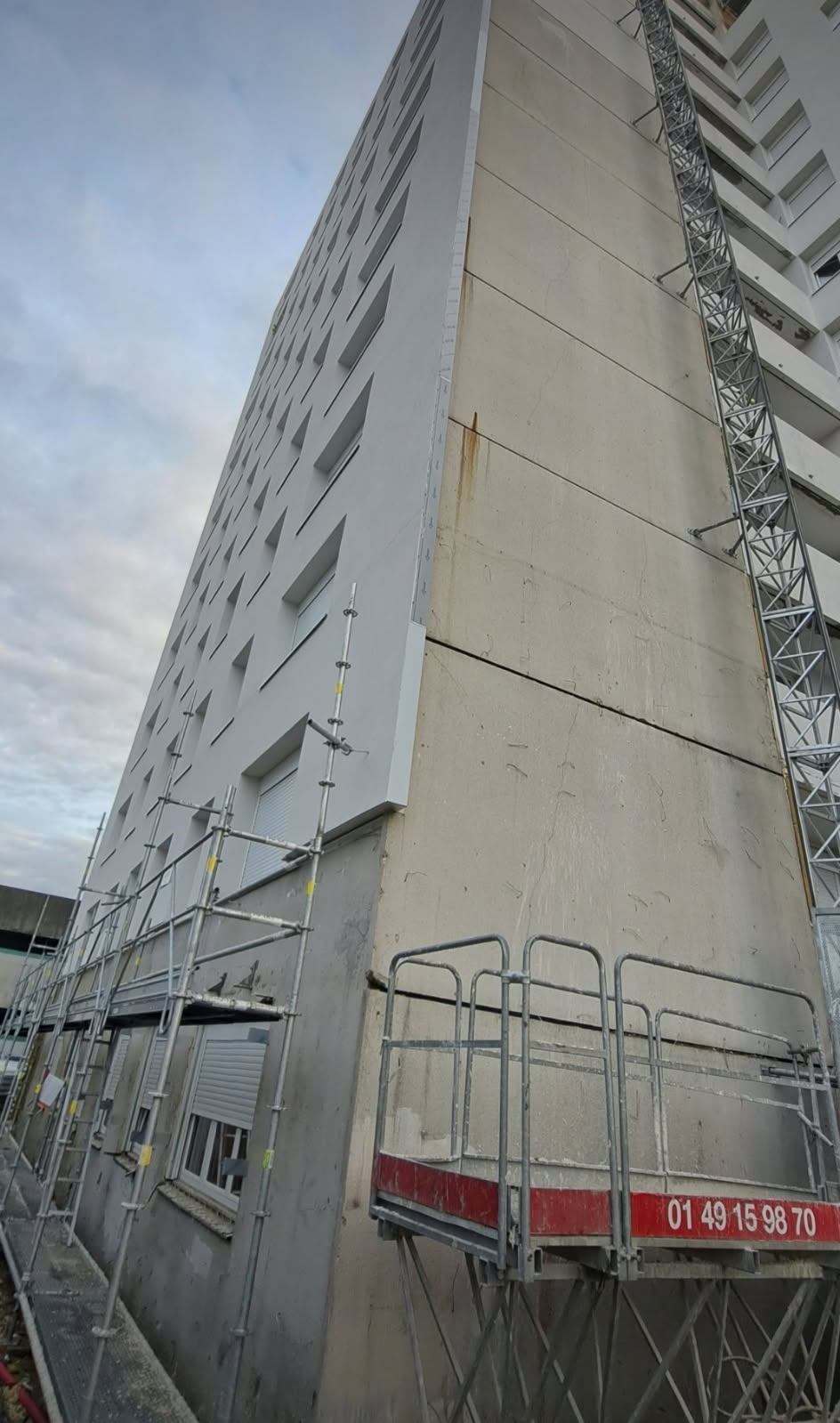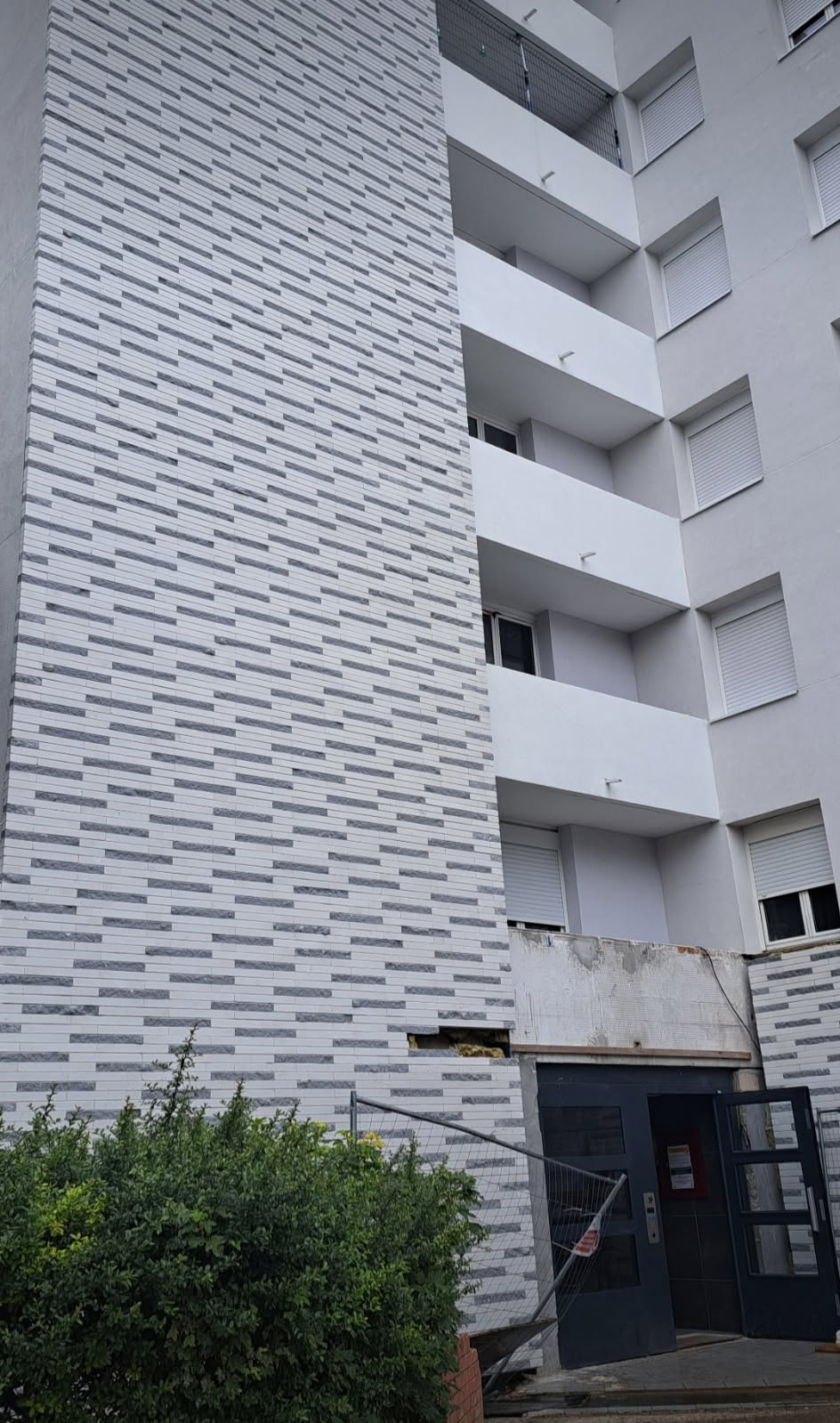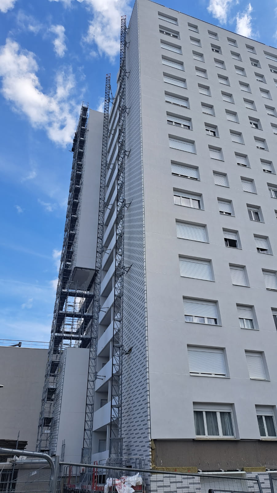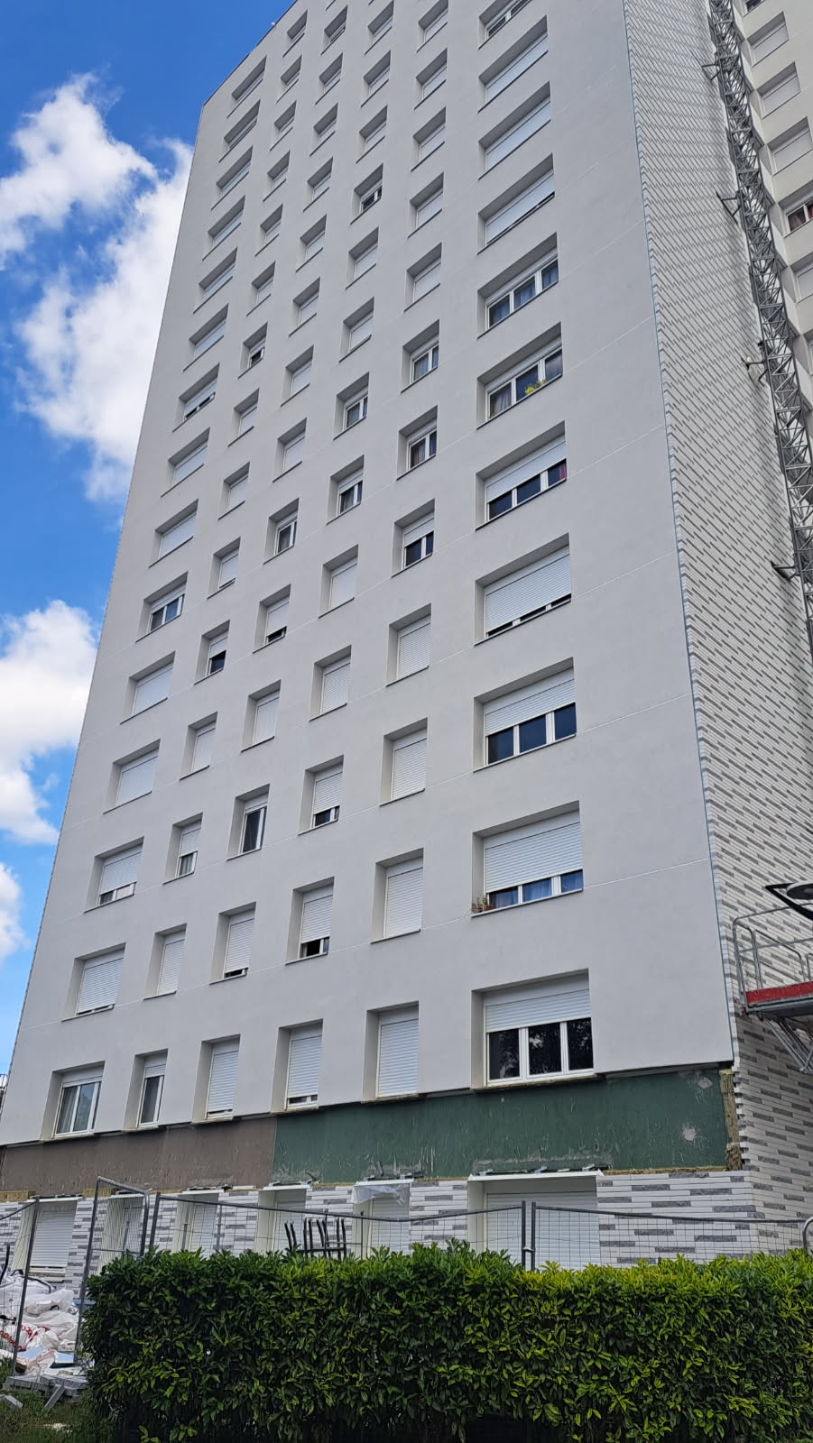Immeuble de Stains (93): ITE existante déposée, réfection des sols des balcons existants, ravalement de façade avec ITE (laine de roche), finition talochée avec appui de fenêtre en zinc. Pour les façades avec de la brique, mise en place d’un ITE avec de la laine de roche, remontage du mur avec de la brique, couverture de l’ensemble avec bavette zinc en haut de l’ensemble
