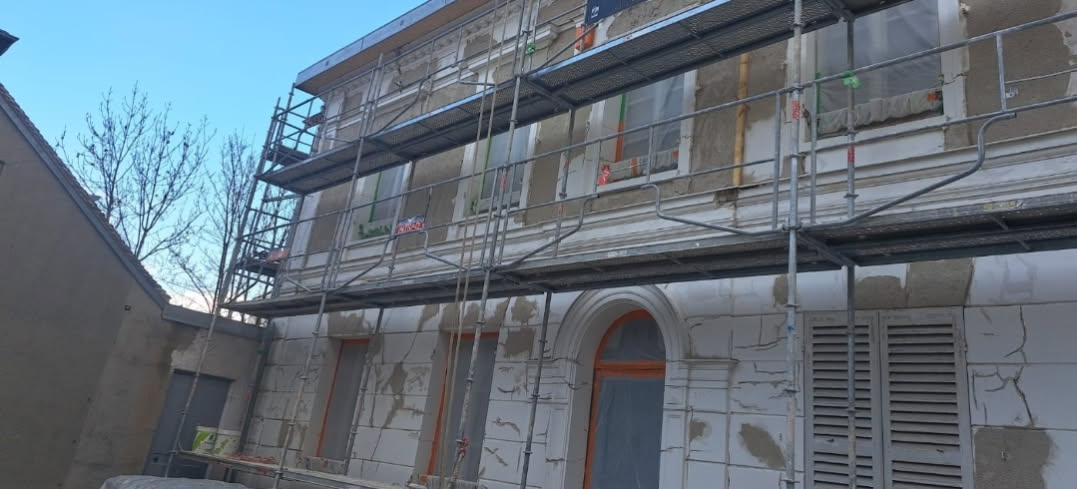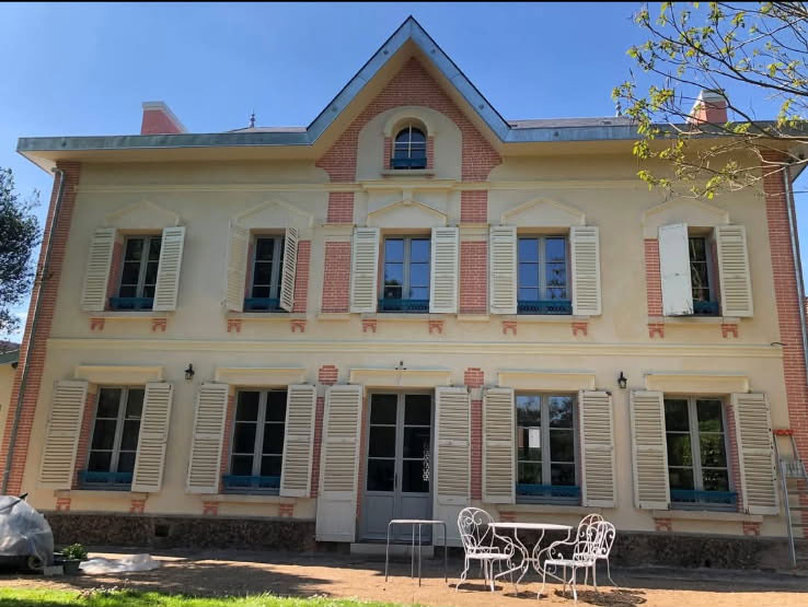 Maison Anet (28): démontage des volets pour reprise au sol (ponçage, rebouchage, mise en peinture), façade existante en plâtre, nettoyage haute pression, intervention de maçonnerie en ré agréage, rebouchage avec ravalement de façade, finition maçonnerie au badigeon et à l’éponge (mixte par rapport au support), descente des accessoires d’eau pluviale et remise à neuf (grattage, décapage et peinture).